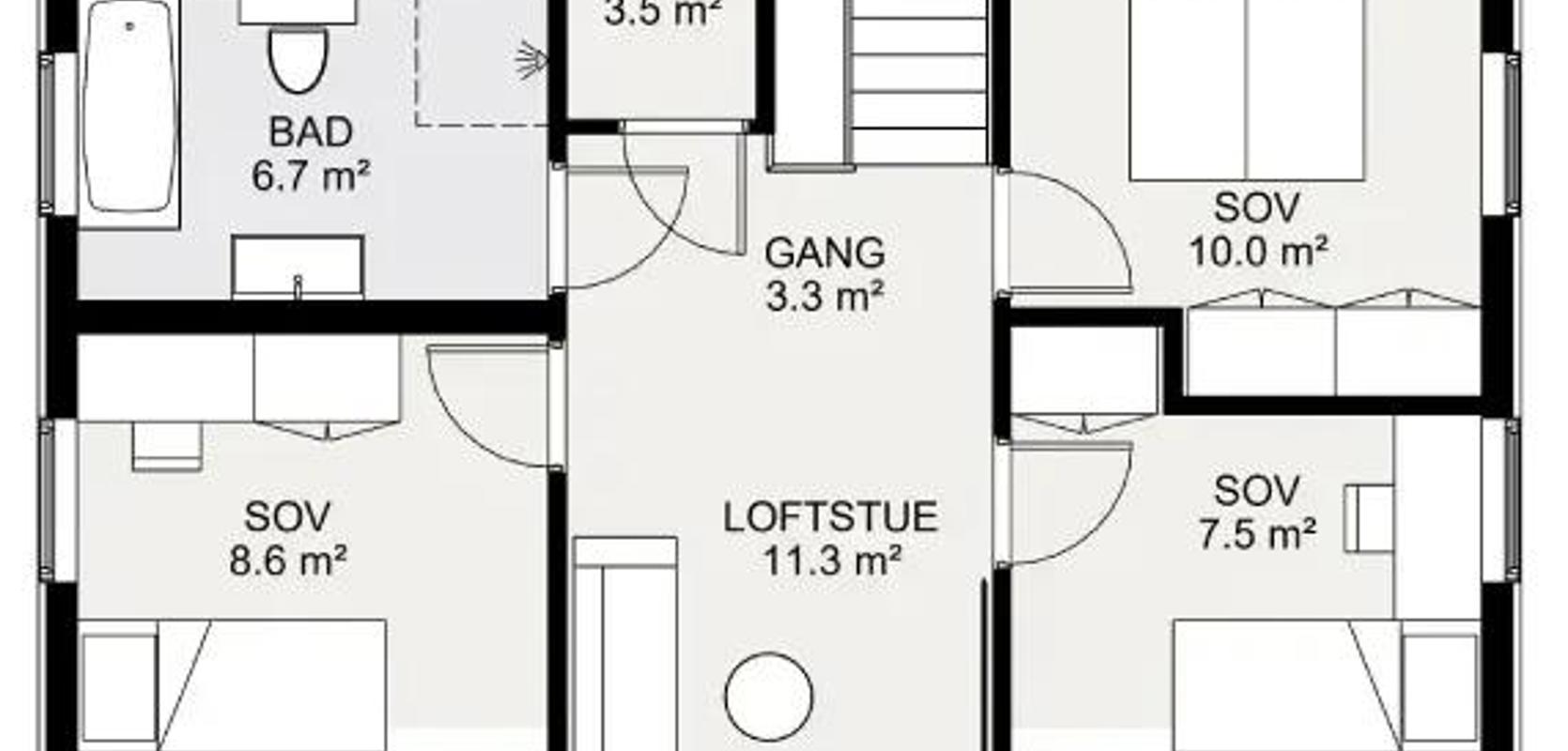 I andre etasje finner du tre soverom, bad, bod og en koselig loftstue med utgang til balkong. Huset kan leveres med kjeller, og deler av stuen kan også gjøres om til et soverom i første etasje.